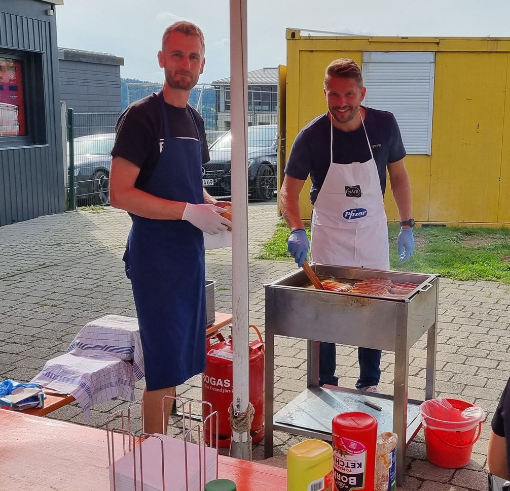 Am Grill.Bei der Verpflegung durch die Basketballer am Grill und einigen Müttern von der der D-Jugend in der Getränke- und Essensausgabe kam es teilweise zu langen Schlangen. Aber jeder Gast war gelassen, da sie wussten, dass ganze Geld geht heute an die Familie Svetic. So konnte hier weiter 2250 Euro für die Familie erzielt werden. Die Verkaufsdamen erhielten viel Lob, auch wenn zwei Mal Bier nachgeordert werden musste.